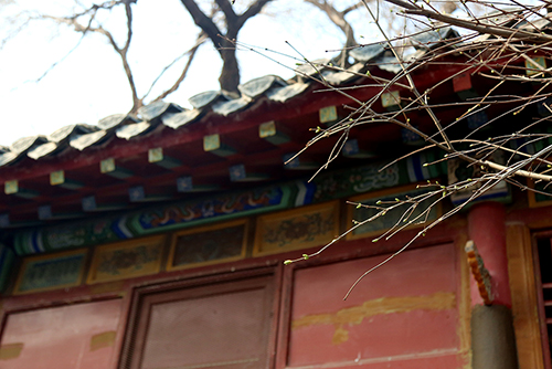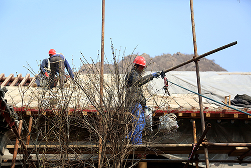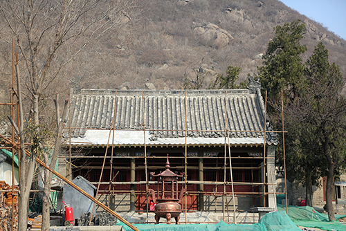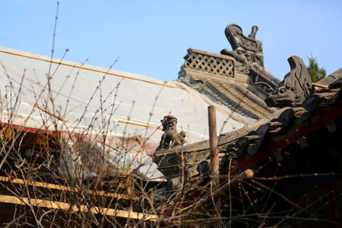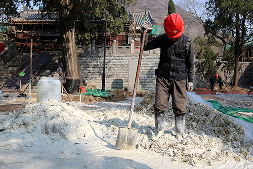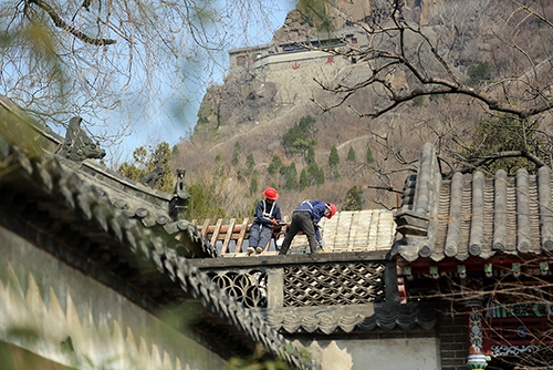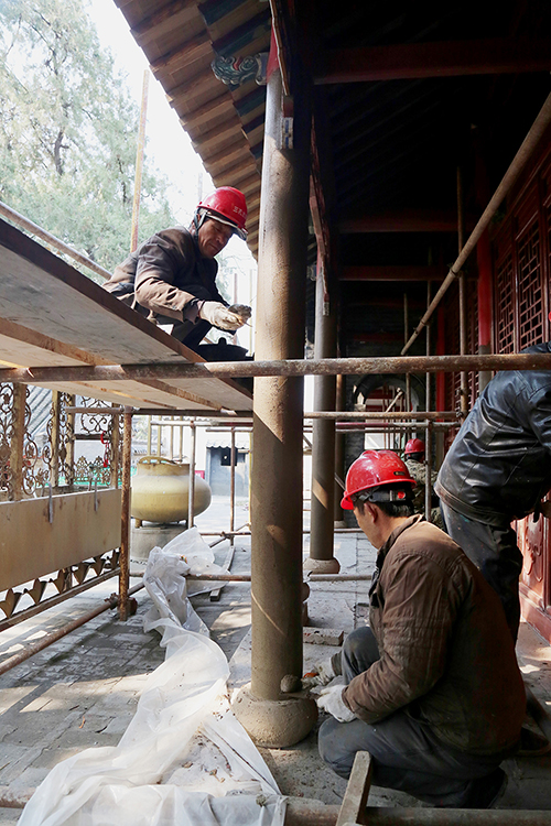在現(xiàn)場可以看到,冬季過后,“修煉內(nèi)功”的綜合管線敷設(shè)、地形塑造、受損的磚作石作木作基底清理工作已基本完成,“濕作業(yè)”階段已經(jīng)全面展開。目前正在進(jìn)行中的主要工作為建筑屋面的修繕,建筑墻體的修補,路面、石階、古磚的清理修復(fù),建筑木構(gòu)件的砍活與重新上漆,木構(gòu)件表面彩繪的清理除塵等工作。