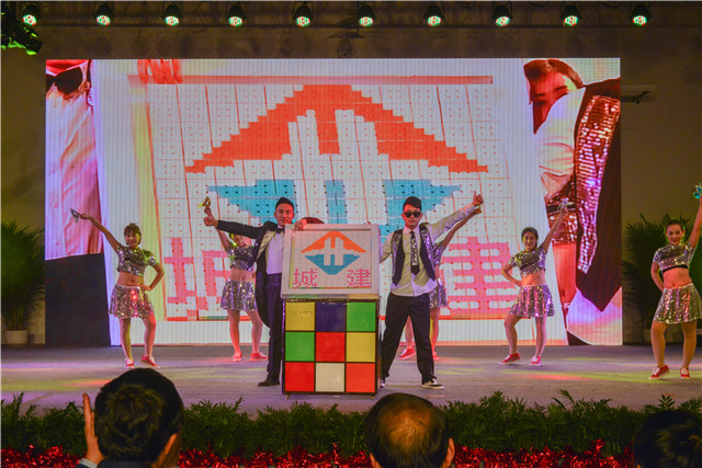 在歡快喜悅的歌舞《拜新年》中,匯演拉開(kāi)序幕,紅紅火火的舞臺(tái),映射著蒸蒸日上的發(fā)展勢(shì)頭。舞蹈《成長(zhǎng)》《奮進(jìn)》以激昂的音樂(lè),吹響了催人奮進(jìn)的號(hào)角,用動(dòng)感的舞步,舞出了城建鐵軍的蓬勃朝氣。《馬路情緣》《鐵軍男相親記》《生日》《真相》《男爭(zhēng)女辯》《筑夢(mèng)同行》等語(yǔ)言類節(jié)目圍繞生產(chǎn)經(jīng)營(yíng)精心編排,真實(shí)感人,催人奮進(jìn)。勵(lì)志感人的歌曲,絢麗多彩的歌伴舞,酷炫的舞蹈,神秘的魔術(shù),魔幻的黑光劇,生龍活虎的京劇,讓觀眾著實(shí)過(guò)了一把眼癮,臺(tái)下掌聲不斷,歡欣喜悅的氣氛一浪高過(guò)一浪。小品里父母、妻子、孩子那一段段心里話,令人感同身受,潸然淚下,家屬們用實(shí)際行動(dòng)表達(dá)了對(duì)企業(yè)最大的理解和支持,大家在這個(gè)溫暖的大家庭中,以誠(chéng)相待,溫馨彼此。在激動(dòng)人心的歌舞串燒《開(kāi)創(chuàng)未來(lái)》中,匯演圓滿落下帷幕,集團(tuán)領(lǐng)導(dǎo)與演職人員合影留念。