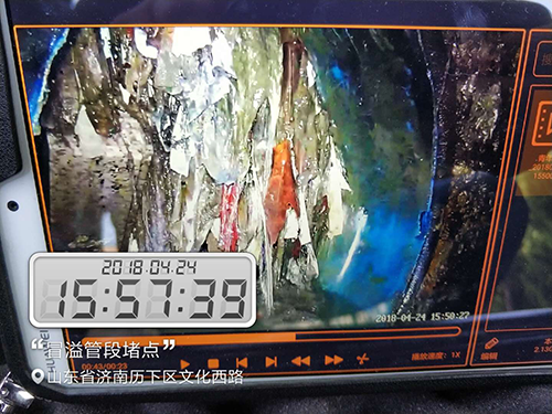 應急搶險小組立即制定搶險計劃,使用管道潛望鏡等檢測設備對冒溢原因進行排查,經(jīng)排查初步判定為下游管口阻塞造成,由于現(xiàn)場處于綠化帶內(nèi),機械設備無法進入,搶險小組根據(jù)實際情況現(xiàn)場設計焊接作業(yè)工具,配合管道潛望鏡對管道進行人工掏挖,經(jīng)過4個小時的清理,將管道內(nèi)部分垃圾清除,首先確保檢查井停止冒溢。但經(jīng)過管道潛望鏡再次查看發(fā)現(xiàn)管道內(nèi)依然存在40*20*15cm、60*20*15cm立沿石兩塊無法完全清除,后期仍存在冒溢風險,為確保管網(wǎng)長期正常運行,搶險小組當機立斷制定人工下井作業(yè)清除方案,務必將阻塞點徹底清除掉。