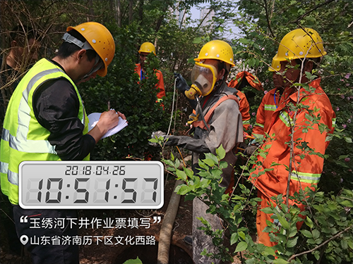 由于人工下井作業(yè)危險較大,方案制定完成后搶險小組立即向公司安全質(zhì)量部進行匯報,經(jīng)過安全質(zhì)量部批準于4.26日進行人工下井作業(yè)。現(xiàn)場工作人員嚴格按照下井作業(yè)施工流程,認真填寫《下井作業(yè)票》、《有限空間作業(yè)票》等最終將工作人員將阻塞在管口的立沿石等阻塞物取出,管道又恢復了正常運行,玉繡河也恢復了往日的清澈。