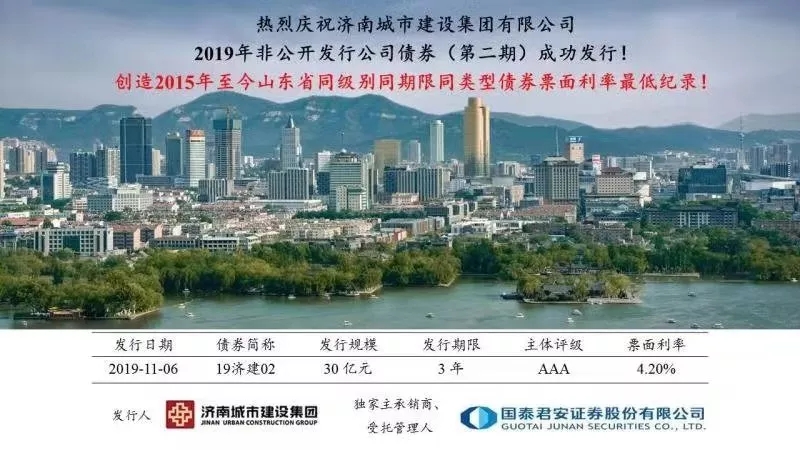 2019年11月6日,濟(jì)南城市建設(shè)集團(tuán)非公開發(fā)行2019年公司債券(第二期)(“19濟(jì)建02”)發(fā)行圓滿落地,創(chuàng)造2015年至今山東省同級(jí)別同期限同類型債券票面利率最低紀(jì)錄。本期債券發(fā)行得到了市場(chǎng)的廣泛認(rèn)可,投資者認(rèn)購(gòu)踴躍。19濟(jì)建02低利率發(fā)行,充分展現(xiàn)了投資者對(duì)建設(shè)集團(tuán)領(lǐng)先的行業(yè)地位、良好的品牌形象以及穩(wěn)健的財(cái)務(wù)政策等方面的肯定。