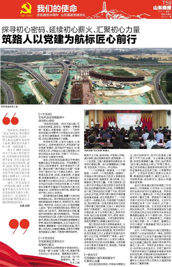 誰能想到這樣新穎音樂黨課的背后,其實是一群“大老粗”工程人呢。就拿濟南大東環(huán)這個項目來說,需跨越東巨野河、世紀大道、經(jīng)十東路等難關(guān),哪一個節(jié)點工程都是千頭萬緒、亟待突破,可是逢山開路、遇水架橋,路還是要修起來,困難就要一個一個去克服。工程人就是要用成績說話,當黨員們唱起紅歌,戰(zhàn)斗的激情就在心中激蕩,攻堅克難,不忘初心,牢記使命。