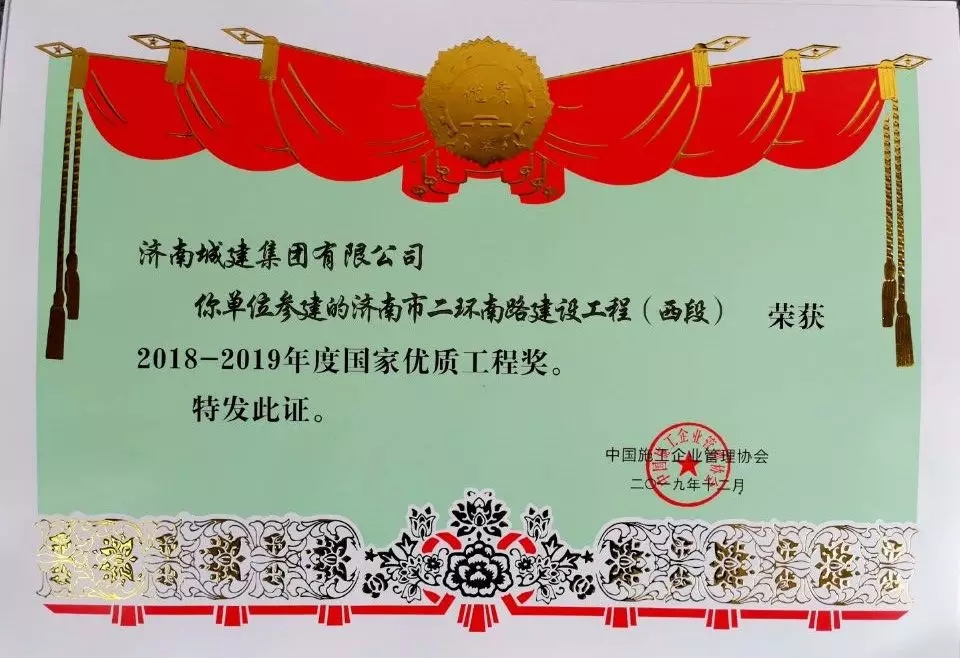 近日,中國施工企業(yè)管理協(xié)會在國家會議中心召開“2019年國家優(yōu)質(zhì)工程獎總結(jié)表彰大會”,來自工程建設(shè)領(lǐng)域的各關(guān)聯(lián)協(xié)會及建設(shè)、勘察、設(shè)計、施工、監(jiān)理等700余家單位的1500名代表參加了會議。由濟南城市建設(shè)集團所屬濟南黃河路橋建設(shè)集團有限公司、濟南城建集團有限公司分標(biāo)段承建的濟南市二環(huán)南路建設(shè)工程(西段)榮獲“2018-2019年度國家優(yōu)質(zhì)工程獎”。