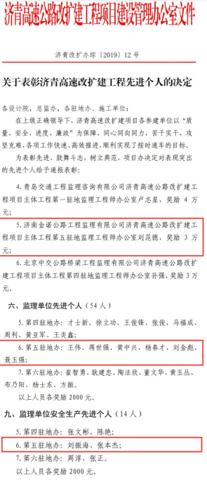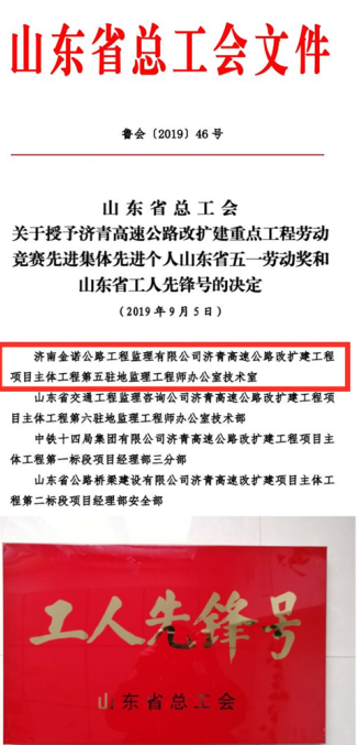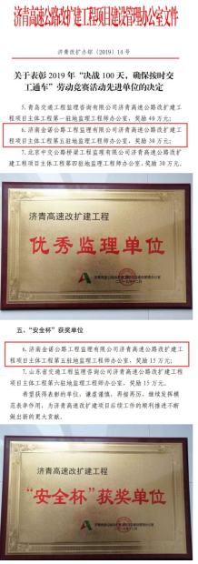 近日,由濟(jì)南城市建設(shè)集團(tuán)所屬濟(jì)南金諾公路工程監(jiān)理有限公司承建的濟(jì)青高速第五駐地辦榮獲2019年山東省總工會(huì)“工人先鋒號(hào)”榮譽(yù)稱(chēng)號(hào), 同時(shí),在2019年度該項(xiàng)目“決戰(zhàn)100天,確保按時(shí)交工通車(chē)”勞動(dòng)競(jìng)賽活動(dòng)中表現(xiàn)突出,榮獲2019年濟(jì)青高速改擴(kuò)建工程“優(yōu)秀監(jiān)理單位”、“安全杯”獲獎(jiǎng)單位榮譽(yù)稱(chēng)號(hào);其中,項(xiàng)目負(fù)責(zé)人獲得“優(yōu)秀駐地監(jiān)理工程師”稱(chēng)號(hào), 6位同志獲得“監(jiān)理單位先進(jìn)個(gè)人”稱(chēng)號(hào), 2位同志獲得“監(jiān)理單位安全生產(chǎn)先進(jìn)個(gè)人” 稱(chēng)號(hào),共獲得專(zhuān)項(xiàng)獎(jiǎng)勵(lì)49.6萬(wàn)元。