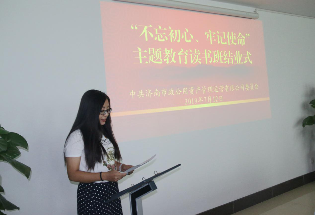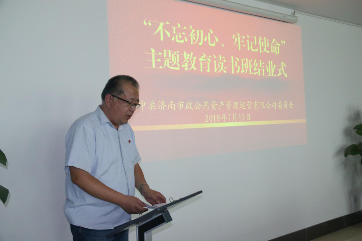 根據(jù)中央要求和省委、市委安排部署,按照市委主題教育領(lǐng)導(dǎo)小組辦公室《關(guān)于舉辦第二期“不忘初心、牢記使命”主題教育讀書(shū)班的通知》和濟(jì)南城市建設(shè)集團(tuán)黨委要求,7月5日至7月12日期間,濟(jì)南市政公用資產(chǎn)管理運(yùn)營(yíng)有限公司舉辦“不忘初心、牢記使命”主題教育讀書(shū)班,并于7月12日上午在公司1066會(huì)議室舉辦結(jié)業(yè)儀式。公司黨委副書(shū)記、總經(jīng)理李少成同志出席結(jié)業(yè)式并講話,公司領(lǐng)導(dǎo)班子成員、主管及以上人員、全體黨員參加了此次結(jié)業(yè)式,會(huì)議由公司黨委委員、副總經(jīng)理史德茂同志主持。