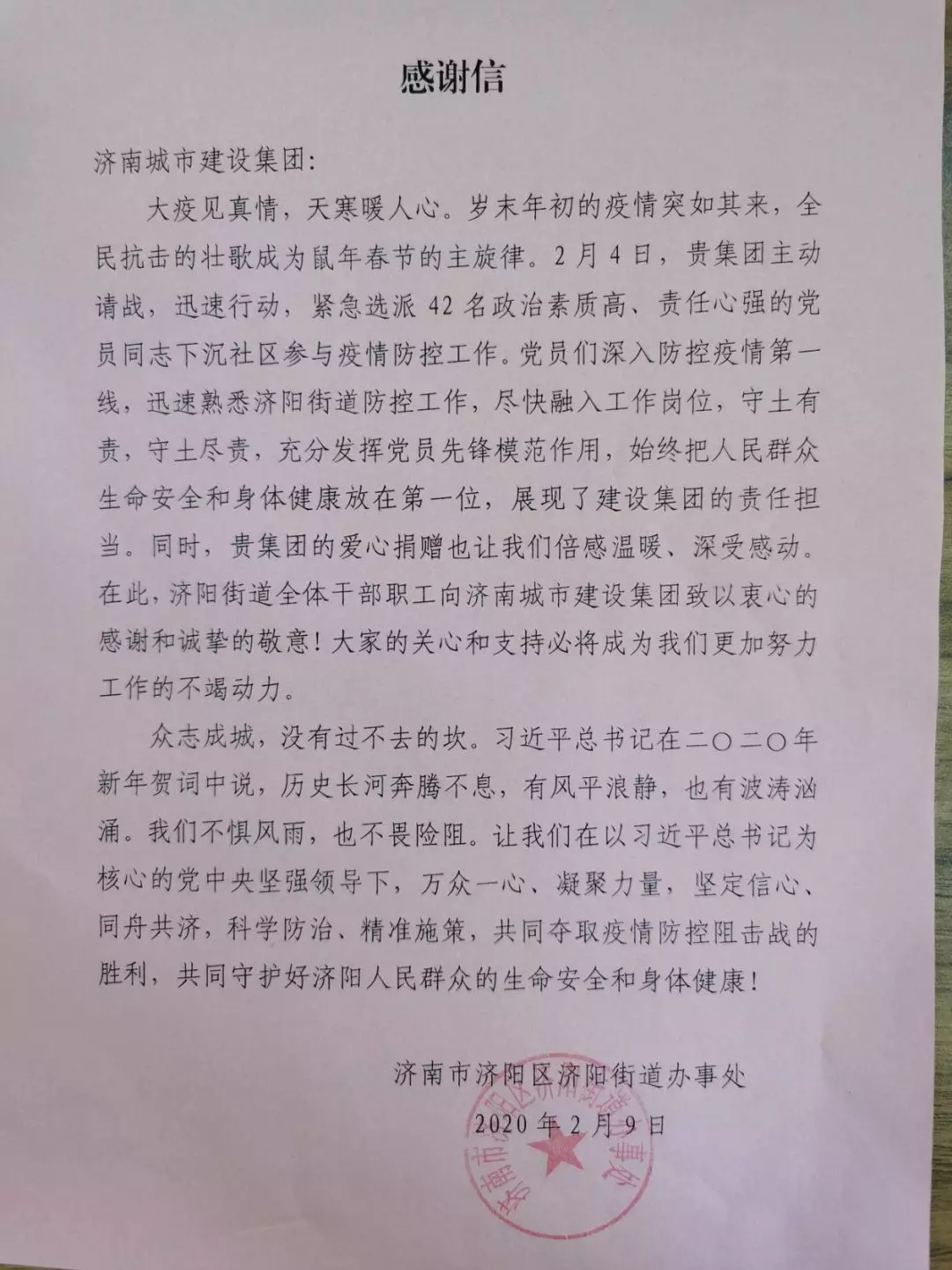 濟(jì)陽(yáng)街道辦事處專(zhuān)門(mén)給集團(tuán)寫(xiě)了感謝信,濟(jì)陽(yáng)街道康瑞社區(qū)與雅居園物業(yè)管理有限公司還向呂仁鎮(zhèn)、齊鵬飛兩名黨員同志贈(zèng)送了寫(xiě)有“抗擊疫情勇?lián)?dāng),志愿服務(wù)爭(zhēng)先鋒”的錦旗。