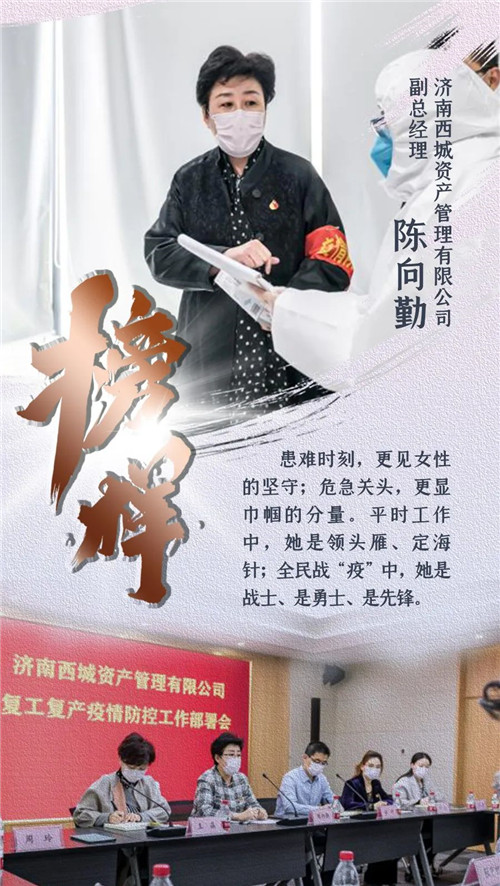 目前,濟南全面復(fù)工復(fù)產(chǎn),陳向勤對疫情防控工作進行再部署、再強調(diào)、再落實,做到“十個一律”、“十個嚴禁”。她提前出手、摸底調(diào)查,切實堅守聯(lián)防聯(lián)控嚴密防線,幫助運營單位制定應(yīng)對措施,關(guān)鍵時刻施以援手,保障復(fù)工復(fù)產(chǎn)后資產(chǎn)管理公司所轄寫字樓、商業(yè)綜合體的疫情防控工作萬無一失。