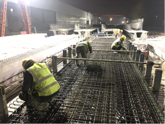 東巨野河2號(hào)大橋預(yù)制梁板的架設(shè)為全線預(yù)制梁板架設(shè)的難點(diǎn),該橋全長(zhǎng)近千米,架設(shè)角度、重量及梁寬都是需一一克服的重點(diǎn),項(xiàng)目采用220噸大型架橋機(jī)進(jìn)行架設(shè),梁寬與架橋機(jī)內(nèi)寬僅有0.2米的空隙,為確保安全,架梁全過程兩側(cè)同時(shí)監(jiān)控,為保證梁板架設(shè)的進(jìn)度,項(xiàng)目部主動(dòng)增加設(shè)備投入,果斷采用兩臺(tái)架橋機(jī)兩幅同步架設(shè),最快時(shí)一天架設(shè)7片梁板。不僅跨越東巨野河,還要跨越交通繁忙的世紀(jì)大道、經(jīng)十東路,每一項(xiàng)節(jié)點(diǎn)工程都是千頭萬緒,逐一突破。