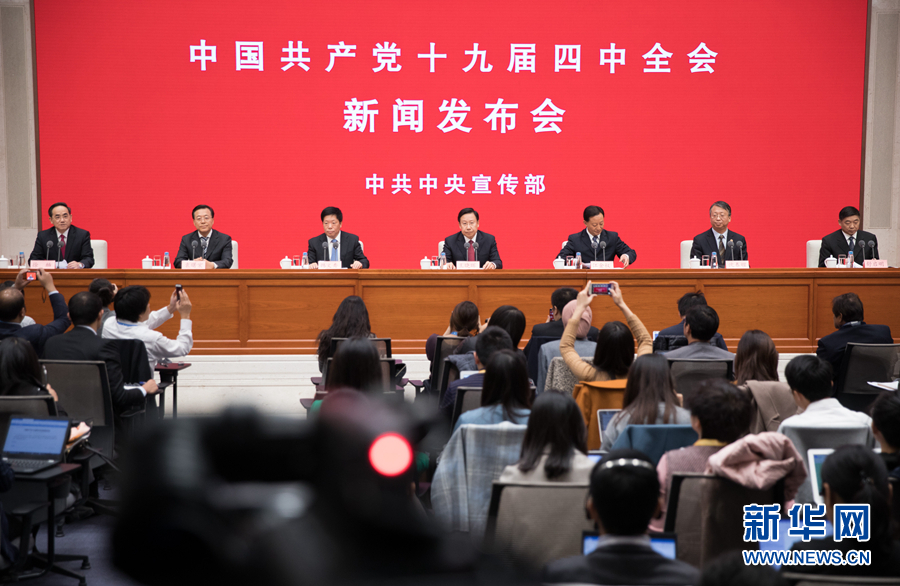 11月1日,中共中央宣傳部在北京舉行中國共產(chǎn)黨十九屆四中全會新聞發(fā)布會,請中央宣傳部分管日常工作的副部長、中央政策研究室副主任王曉暉,中央政策研究室分管日常工作的副主任江金權(quán),中央財經(jīng)委員會辦公室分管日常工作的副主任韓文秀,全國人大常委會法工委主任、港澳基本法委主任沈春耀,司法部黨組書記、副部長袁曙宏,全國政協(xié)副秘書長舒啟明介紹有關(guān)情況,并答記者問。中央宣傳部副部長、國務(wù)院新聞辦公室主任徐麟主持新聞發(fā)布會。新華社記者金立旺攝