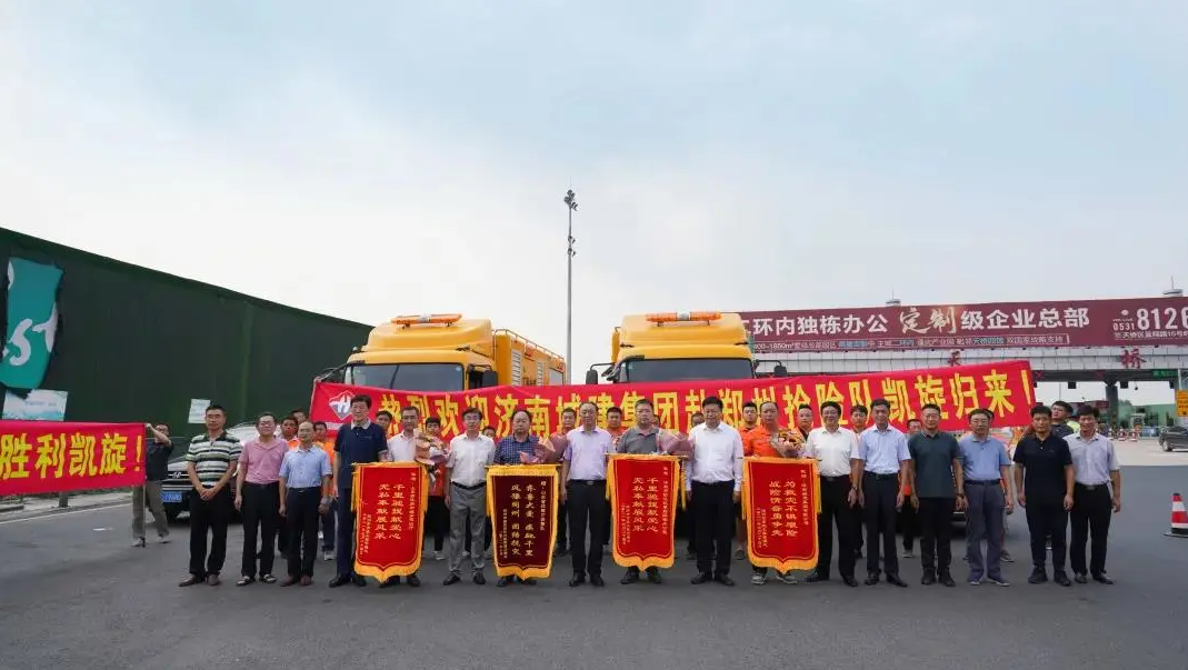 7月25日一早,城建集團(tuán)公司應(yīng)急搶險隊經(jīng)過休整準(zhǔn)備返濟(jì)時,鄭州惠濟(jì)區(qū)老百姓自發(fā)來到現(xiàn)場,為救援隊員們送上鮮花、食品等禮物,拉起“歡送山東省住建廳救援隊英雄們平安回家”“向搶險救災(zāi)的英雄致敬”的條幅,夾道歡送應(yīng)急救援隊。
