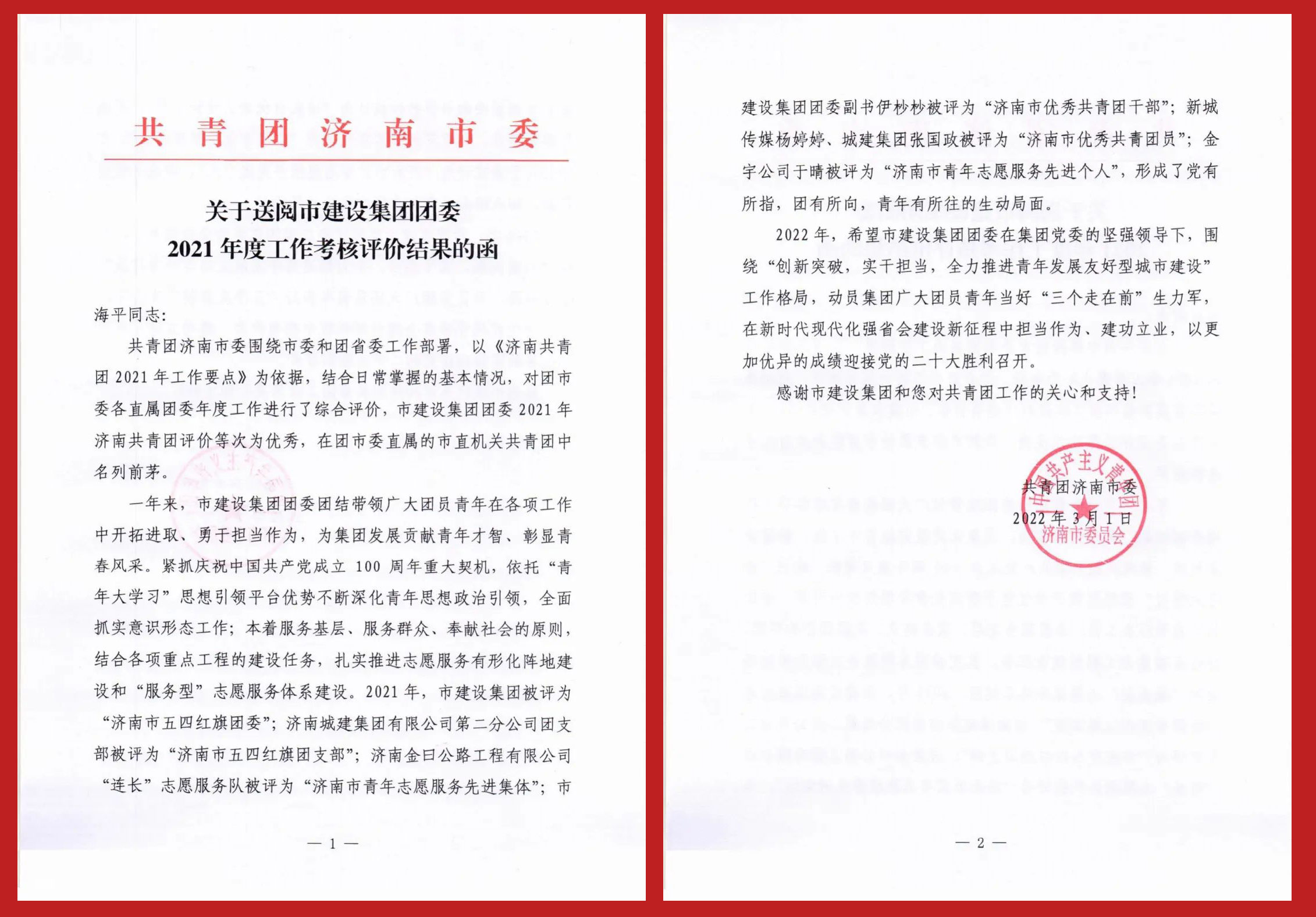 2022年3月1日,共青團濟南市十七屆四次全委(擴大)會議召開。會議通報了2021年度全市共青團工作綜合考核情況,建設集團團委被評為2021年度濟南市“紅旗團委”。共青團濟南市委向集團主要領導發(fā)來了《2021年建設集團團工作考核評價函》,并向集團對共青團工作的支持和關心表示了感謝。