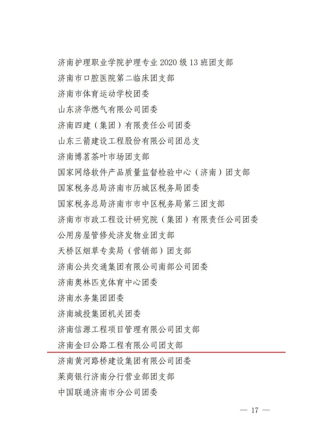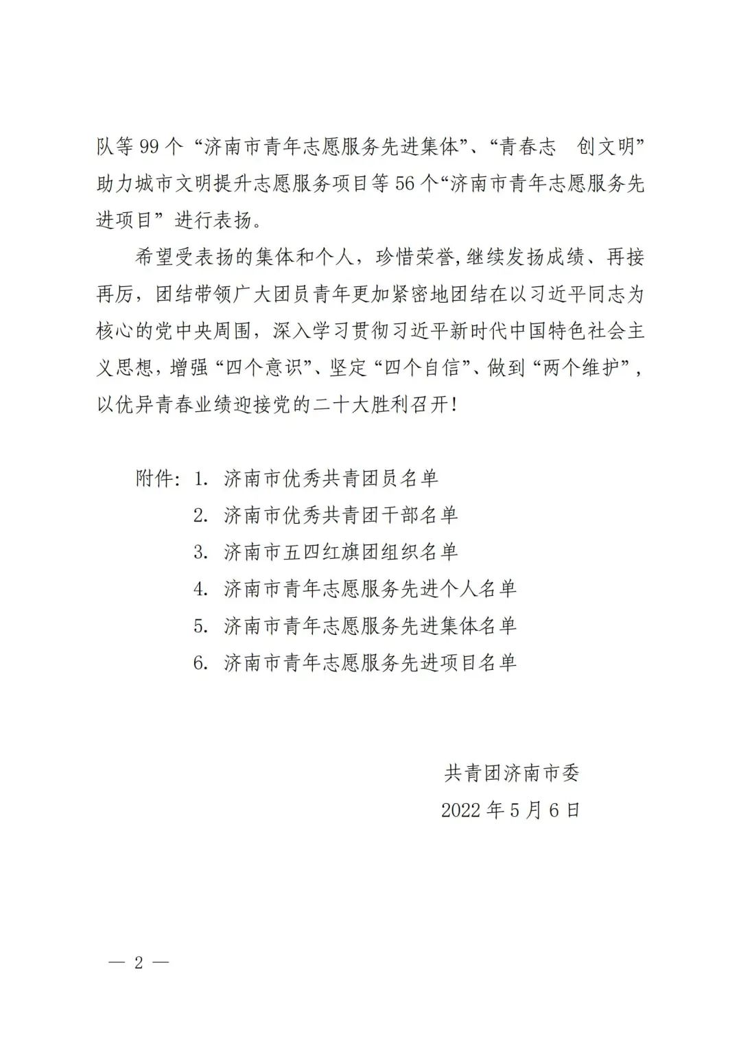 濟南城市建設集團各級團組織和廣大團員青年、共青團干部將以受到表彰的單位和個人為榜樣,更加緊密地團結在以習近平同志為 核心的黨中央周圍,深入學習貫徹習近平新時代中國特色社會主義思想,增強“四個意識”、堅定“四個自信”、做到“兩個維護”,以優(yōu)異青春業(yè)績迎接黨的二十大勝利召開!