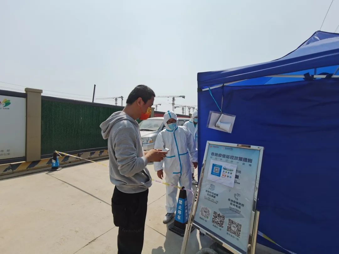 在濟(jì)南市新舊動(dòng)能轉(zhuǎn)換起步區(qū)大橋安置五區(qū)項(xiàng)目入口,幾名身穿防護(hù)服的工作人員嚴(yán)格對(duì)進(jìn)出場(chǎng)人員進(jìn)行信息自動(dòng)化登記和健康信息核驗(yàn)。