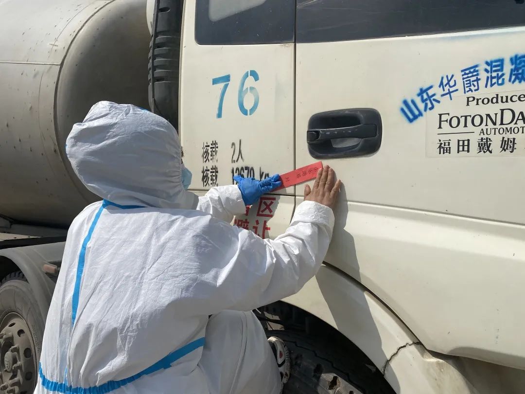 目前的建設(shè)階段,施工現(xiàn)場(chǎng)必須有鋼筋、混凝土的持續(xù)供應(yīng)。工地設(shè)置了材料進(jìn)場(chǎng)專(zhuān)用過(guò)渡區(qū),對(duì)材料進(jìn)行防疫消殺后才能進(jìn)入現(xiàn)場(chǎng)使用。在封閉區(qū)門(mén)口,記者看到,兩輛混凝土攪拌車(chē)正準(zhǔn)備進(jìn)入現(xiàn)場(chǎng)作業(yè)。管理人員在進(jìn)行必要的信息查驗(yàn)登記后,在車(chē)門(mén)貼上封條,對(duì)車(chē)體消殺之后,攪拌車(chē)順利進(jìn)入了現(xiàn)場(chǎng)施工。宋丹生介紹,貼封條、禁止司機(jī)下車(chē),可最大限度避免施工人員與外界的接觸。