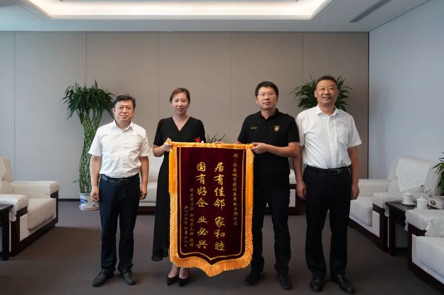 7月18日,一面印有“居有佳鄰家和睦 國有好企業(yè)必興”的錦旗送至建設(shè)集團,這是濟南市民何先生對集團職工何倩給予其妻子的及時幫助表示誠摯的感謝。集團黨委副書記鐘善良、政工部負責同志出席活動。