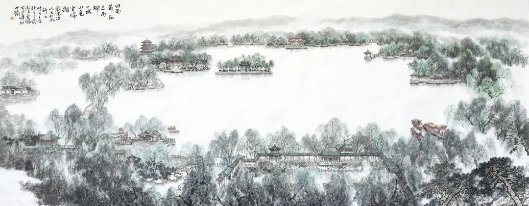 “大明湖是濟(jì)南符號(hào)的代表之一,也承載了濟(jì)南過去的歷史,更是濟(jì)南從‘大明湖時(shí)代’向‘黃河時(shí)代’跨越轉(zhuǎn)變的見證”,李慶杰說:“在創(chuàng)作中保留了大明湖原始景色,同時(shí)融入大明湖新湖擴(kuò)建后的新地標(biāo),將傳統(tǒng)與現(xiàn)代融合,既體現(xiàn)濟(jì)南厚重的歷史也展現(xiàn)了濟(jì)南融入新時(shí)代發(fā)展的浪潮。”