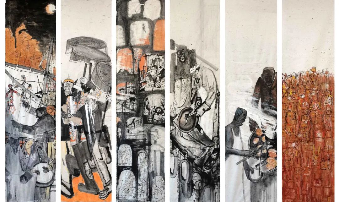 中國美術(shù)家協(xié)會(huì)會(huì)員、山東畫院簽約畫家、濟(jì)南市美術(shù)家協(xié)會(huì)理事何邦輝的《非遺系列》作品,展現(xiàn)了兔子王、濟(jì)南皮影、章丘鐵匠、龍山黑陶、油旋甜沫、鼓子秧歌等6種濟(jì)南非物質(zhì)文化遺產(chǎn)。