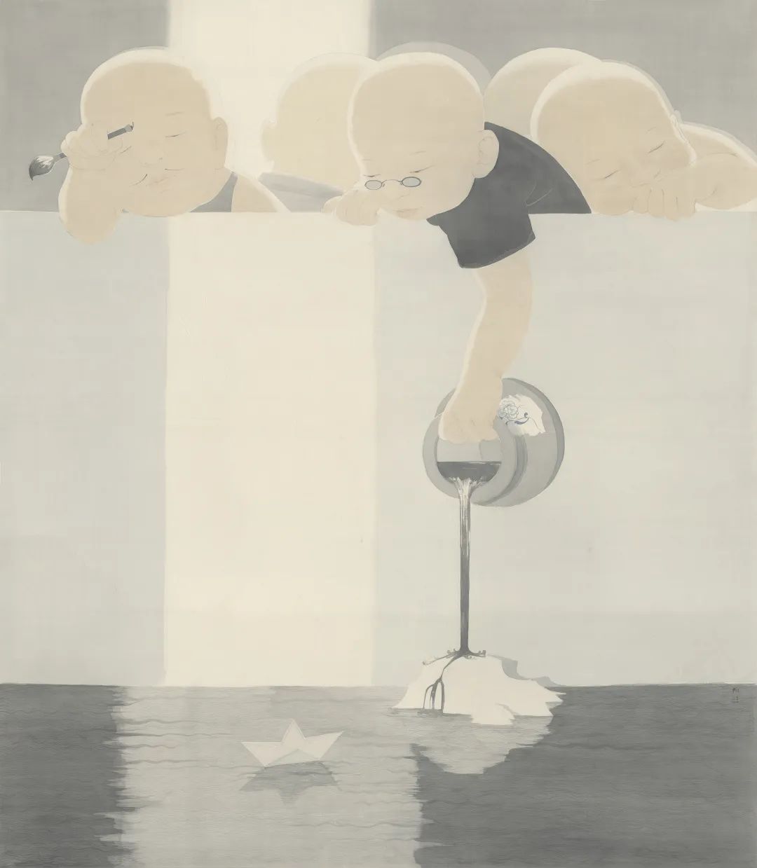 作品《夏》以泉文化為題,畫中的五個(gè)孩童,以孩童的視角展示生命里純粹的感受。畫面中,泉娃預(yù)示著生命之始,泉水預(yù)示著生命之源。同時(shí),毛筆與墨汁展示著傳統(tǒng)和文化,紙船映射著遠(yuǎn)方與航向,光綻放著溫暖與希望。畫中調(diào)子暖灰色,畫面祥和安寧,作品從中也映射出,在日新月異的泉城濟(jì)南,在人們的不斷改革、創(chuàng)新和發(fā)展下,孩子們才能夠有了更加安定祥和的空間與環(huán)境。