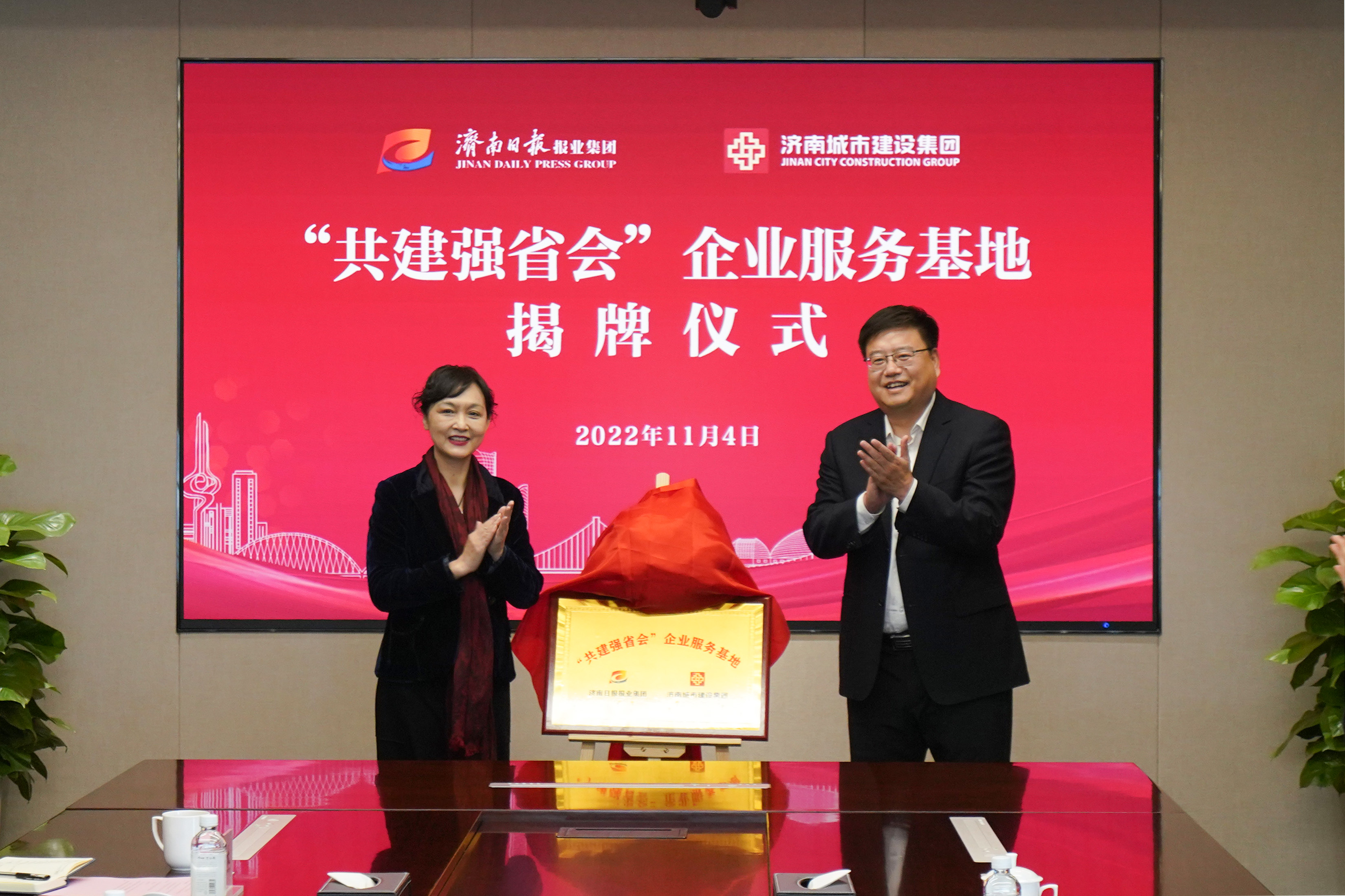 馬利、史海成同志共同為濟南日報報業(yè)集團、濟南城市建設(shè)集團“共建強省會”企業(yè)服務(wù)基地揭牌。