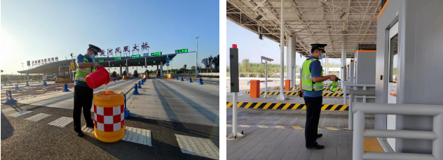 收費(fèi)員加固防撞桶并對工作現(xiàn)場進(jìn)行消殺