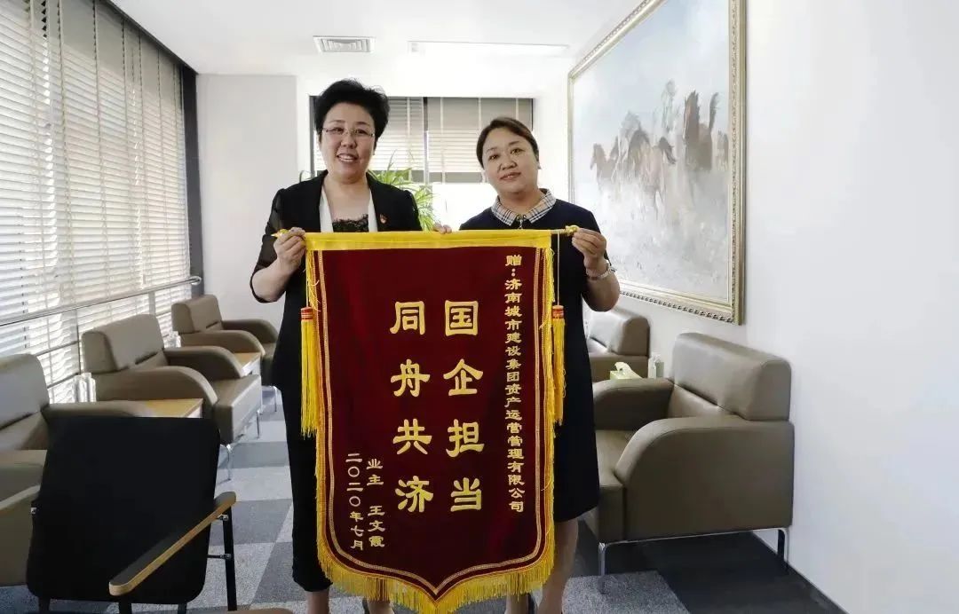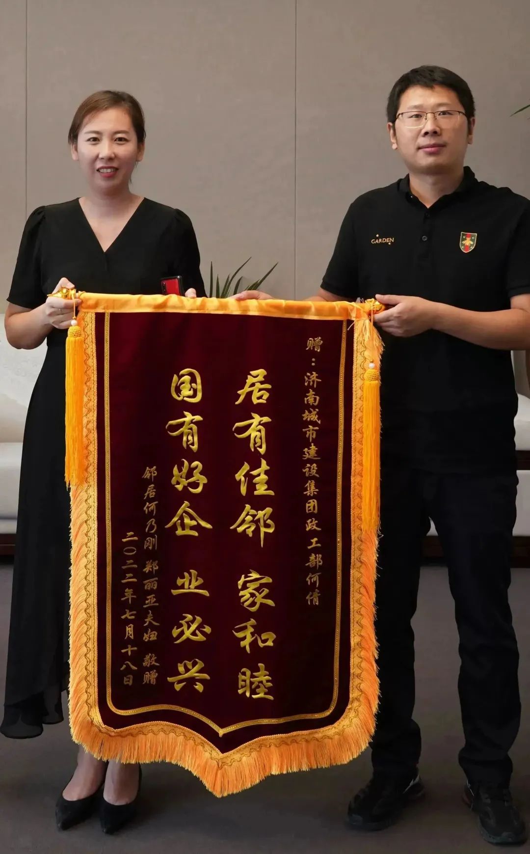 一面“居有佳鄰家和睦 國(guó)有好企業(yè)必興”的錦旗送至建設(shè)集團(tuán),這是濟(jì)南市民何先生對(duì)何倩給予其妻子的及時(shí)幫助所表示的誠(chéng)摯感謝。