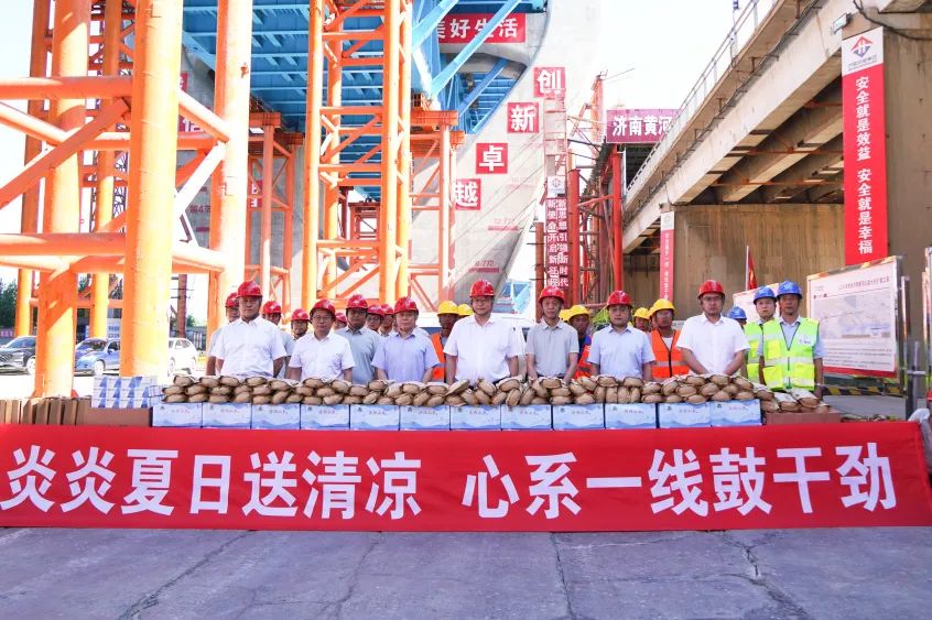 活動中,史海成一行先后前往 G104 濟南黃河公路大橋擴建項目、黃河體育中心專業(yè)足球場項目,詳細了解了現(xiàn)場施工進度、工程質(zhì)量、安全文明施工等情況,并與一線員工親切交流,感謝他們長期以來為項目建設及企業(yè)發(fā)展作出的貢獻,為一線員工發(fā)放防暑降溫物資。