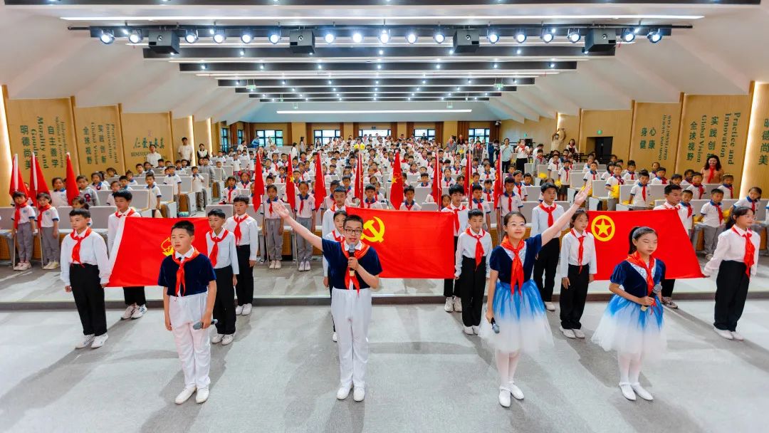 活動現(xiàn)場,與會嘉賓們?yōu)樾氯腙牭纳傧汝爢T們佩戴了紅領(lǐng)巾,為新建中隊授中隊旗,見證了黨、團(tuán)、隊三旗傳遞,徐冬梅為孩子們送上了“六一”寄語,建設(shè)集團(tuán)為孩子們贈送了入隊成長禮物。