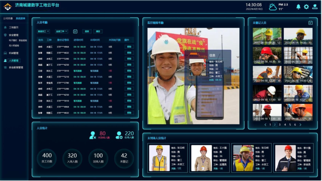 人員管理實現(xiàn)優(yōu)化,G104京嵐線濟南黃河公路大橋擴建工程項目應(yīng)用智能化勞務(wù)人員管理系統(tǒng),系統(tǒng)根據(jù)視頻采樣,可以實時定位,統(tǒng)計當(dāng)日出勤人數(shù),能夠針對不系安全帶、不正確佩戴安全防護用品,違章動火作業(yè)等進行智能識別,并抓拍報警。系統(tǒng)累計保障工地安全620天,累計錄入工人800余人,攝像頭安裝17個,避免了火災(zāi),機械違規(guī)載人,安全用品佩戴不規(guī)范,防護缺失等隱患發(fā)生。