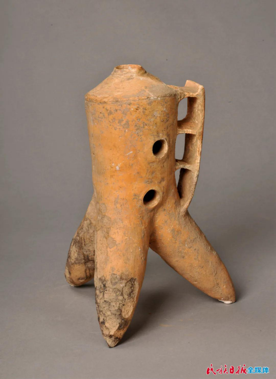 除了玉器,這里還展出了齊家文化最具代表性的器物——陶器。其中一件叫三足盉,是齊家陶器的代表性器物。這件展品問世后,因結(jié)構(gòu)巧妙、制作精良、年代久遠(yuǎn)且保存非常完整,引起了國際上的關(guān)注,獲得世界各國專家學(xué)者的一致好評(píng)。