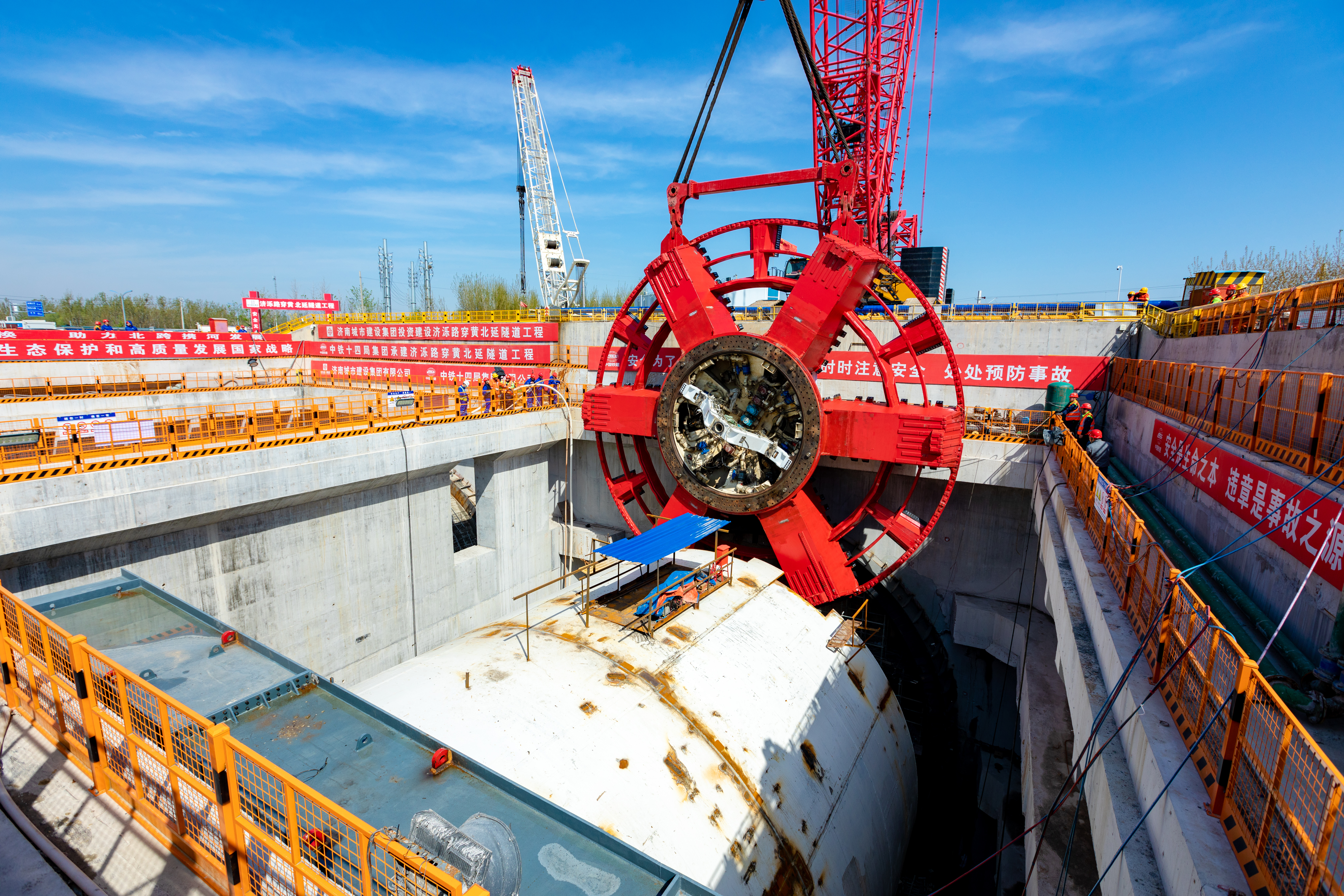 活動現(xiàn)場,與會人員共同啟動并見證了北延隧道“泰山號”盾構(gòu)機(jī)刀盤順利吊裝下井。