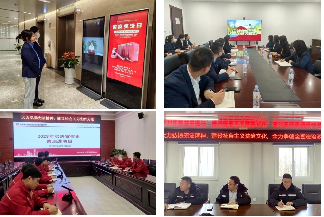 活動(dòng)期間,集團(tuán)在宣傳平臺開設(shè)“法治小課堂”欄目,推送《國家憲法日| 憲法和你的一生有什么關(guān)系?》《憲法宣傳周│“憲法知識知多少”專題測試》《憲法宣傳周│習(xí)近平法治思想應(yīng)知應(yīng)會(huì)(上)》《憲法宣傳周│習(xí)近平法治思想應(yīng)知應(yīng)會(huì)(下)》《憲法宣傳周│習(xí)近平法治思想專題測試》5篇普法推文,并通過集團(tuán)電子屏投放憲法宣傳海報(bào),營造濃厚活動(dòng)氛圍。同時(shí),集團(tuán)積極組織各部室、子公司積極參與2023年全國 “憲法宣傳周”憲法知識網(wǎng)上競答活動(dòng),廣泛動(dòng)員各子公司靈活采用線上、線下相結(jié)合的普法形式,大力加強(qiáng)習(xí)近平法治思想與憲法等內(nèi)容的學(xué)習(xí)宣傳。