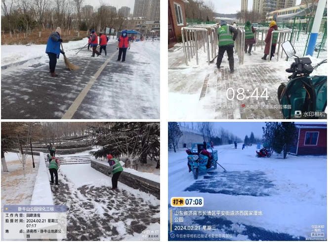濟(jì)南城市建設(shè)集團(tuán)園區(qū)管理有限公司提前做出預(yù)判并發(fā)布相應(yīng)通知,為惡劣天氣應(yīng)急管理做好全面準(zhǔn)備。華山、濟(jì)西濕地、濟(jì)南園博園三大景區(qū)及時(shí)響應(yīng)、迅速行動(dòng),全力組織開展掃雪除冰工作,利用掃雪車、雪鍬、雪鏟等工具,對(duì)景區(qū)內(nèi)各出入口、廣場(chǎng)、道路臺(tái)階等重點(diǎn)部位進(jìn)行清雪、清冰工作并鋪設(shè)相應(yīng)防滑措施,保障道路暢通與市民游客安全,最大限度減少低溫雨雪天氣影響。