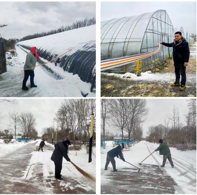 山東濟(jì)西濕地生態(tài)農(nóng)場(chǎng)有限公司提前組織人員檢修溫室大棚設(shè)施,保證正常運(yùn)轉(zhuǎn),同時(shí),加強(qiáng)棚內(nèi)保溫,指導(dǎo)租戶及時(shí)關(guān)閉放風(fēng)口、防風(fēng)保溫。加強(qiáng)值守和巡查,做到隨下隨清,尤其注意加強(qiáng)夜間除雪,避免積雪或冰層過厚壓塌棚室,及時(shí)清理園內(nèi)主次干道積雪,確保道路通暢。
