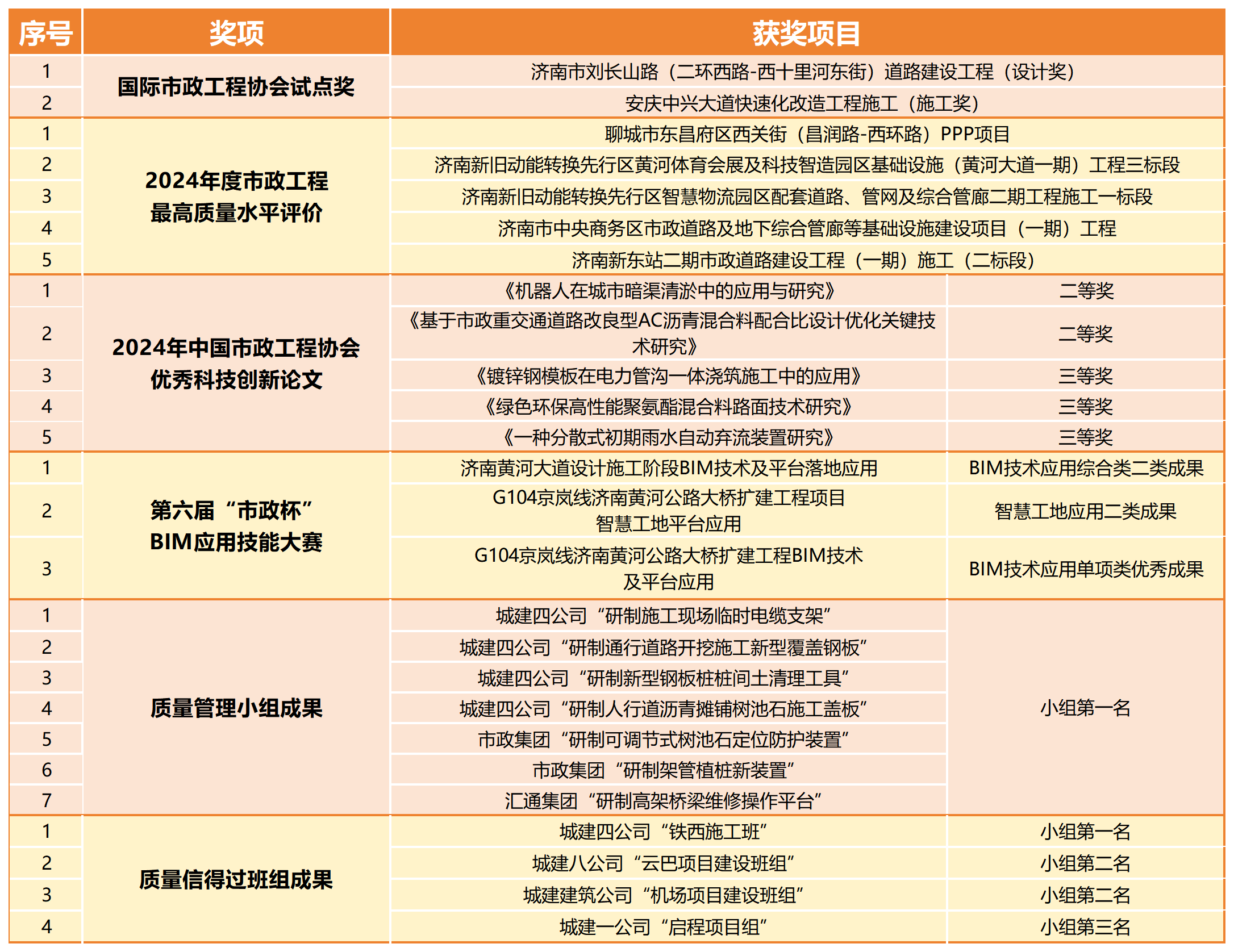 其中,濟南市劉長山路(二環(huán)西路-西十里河?xùn)|街)道路建設(shè)工程等2項工程獲評“國際市政工程協(xié)會試點獎”;聊城市東昌府區(qū)西關(guān)街(昌潤路-西環(huán)路)PPP項目等5項工程獲評“2024年度市政工程最高質(zhì)量水平評價”;《機器人在城市暗渠清淤中的應(yīng)用與研究》等5篇論文獲評“中國市政工程協(xié)會科技創(chuàng)新論文”并入選《中國市政工程協(xié)會科技創(chuàng)新論文集》;城建集團公司3項成果獲評第六屆“市政杯”BIM應(yīng)用技能大賽獎項,其中包括1項BIM技術(shù)應(yīng)用綜合類二類成果、1項智慧工地應(yīng)用二類成果、1項BIM技術(shù)應(yīng)用單項類優(yōu)秀成果;“研制施工現(xiàn)場臨時電纜支架”等7項質(zhì)量管理小組成果獲評小組一等獎第一名;“云巴項目建設(shè)班組”等4項班組成果獲評全國市政工程“質(zhì)量信得過班組”示范級班組前三名。