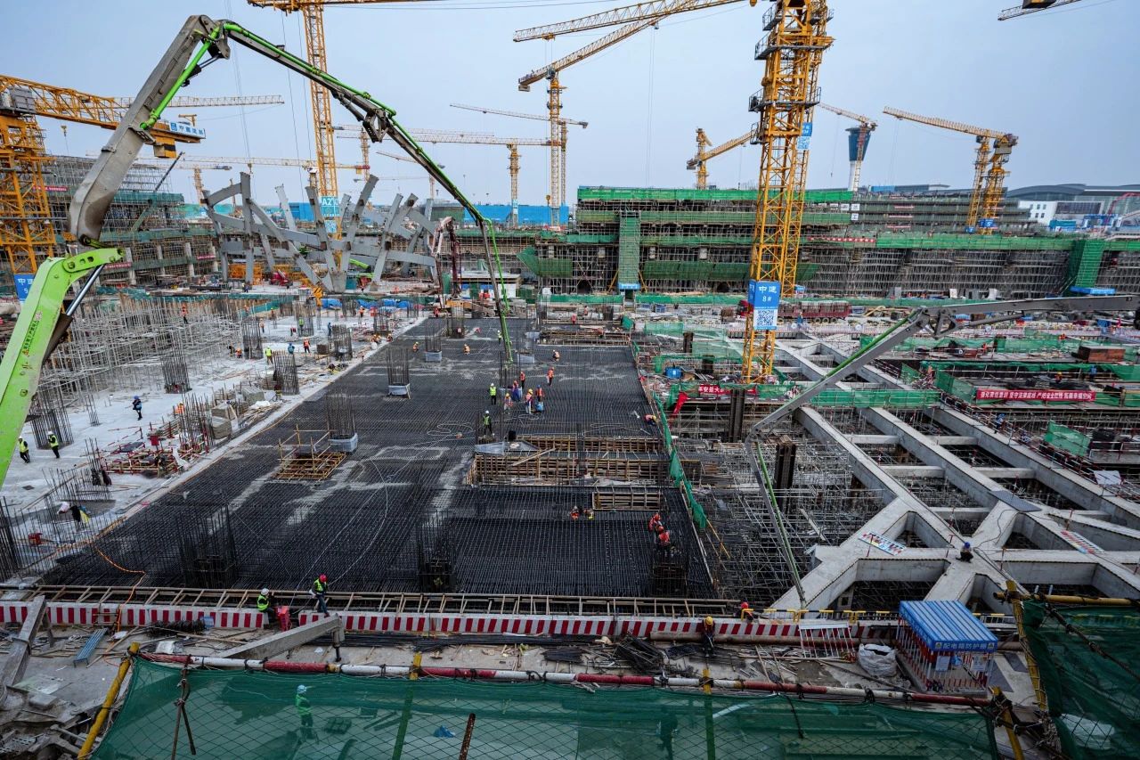 在新建60萬㎡T2航站樓施工現(xiàn)場,項目A指廊正在進(jìn)行樁基施工,B指廊正在進(jìn)行地上結(jié)構(gòu)施工,C指廊已完成主體結(jié)構(gòu)封頂并正在進(jìn)行鋼結(jié)構(gòu)網(wǎng)架吊裝。主樓三、四區(qū)正在進(jìn)行地下結(jié)構(gòu)施工,主樓五區(qū)主體結(jié)構(gòu)已施工至地上二層。