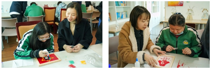 活動現(xiàn)場,志愿者們首先參觀了驛站設施,通過與殘疾人交流,深入了解殘疾人群體需求。在隨后的互動環(huán)節(jié)中,志愿者們與殘疾人共同觀看雷鋒故事短片,進一步弘揚新時代雷鋒精神,同時與殘疾人朋友分組合作,以大米、紅豆等糧食為材料,共同創(chuàng)作“雷鋒主題創(chuàng)意畫”。志愿者們耐心傾聽、細致協(xié)助,以實際行動踐行“奉獻、友愛、互助、進步”的志愿精神。